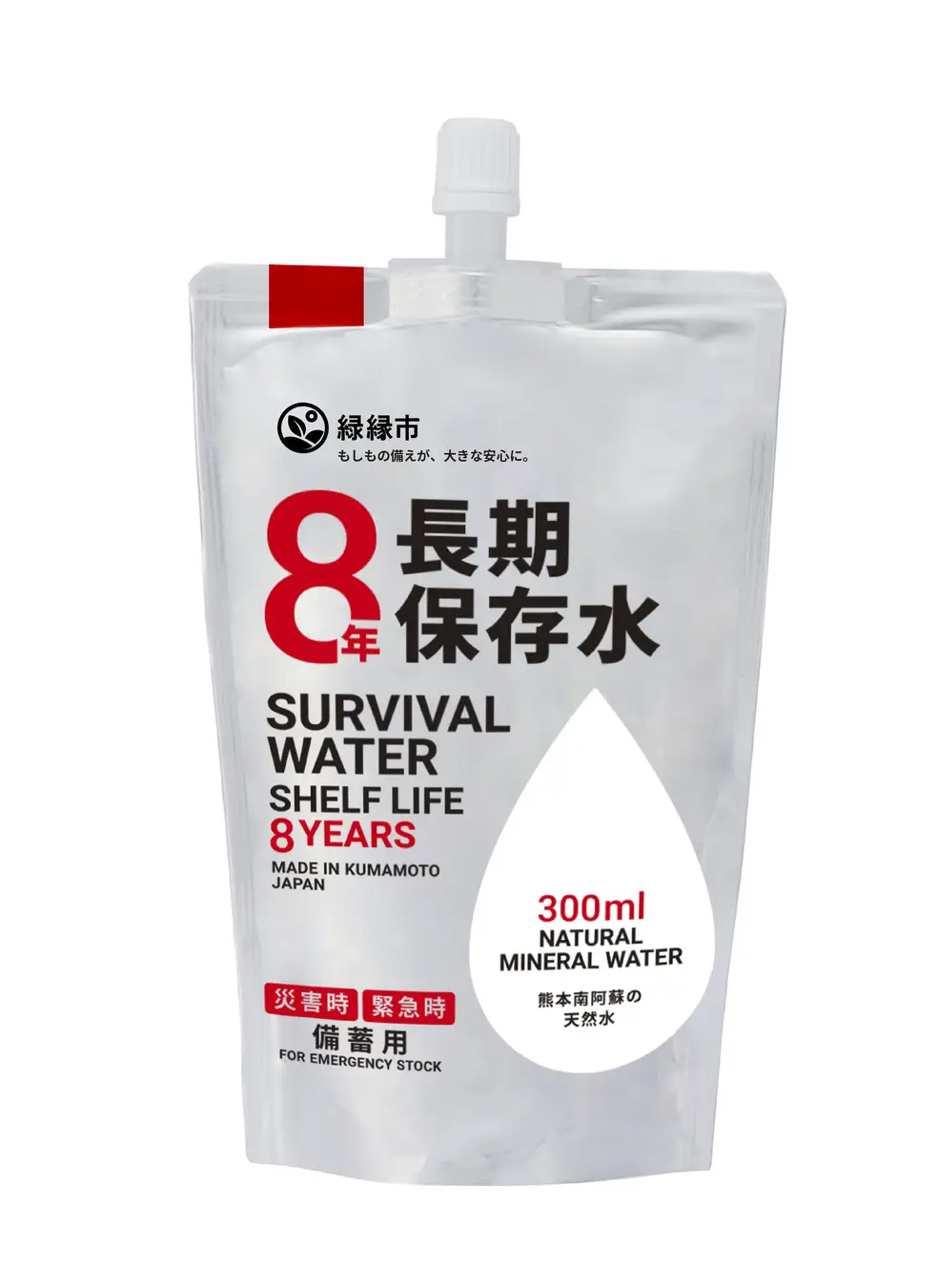 本商品は、熊本県南阿蘇村の天然ミネラルウォーターをアルミ遮光性パウチに封入し、高温加熱殺菌を施した8年以上の賞味期限に対応した長期保存水です。